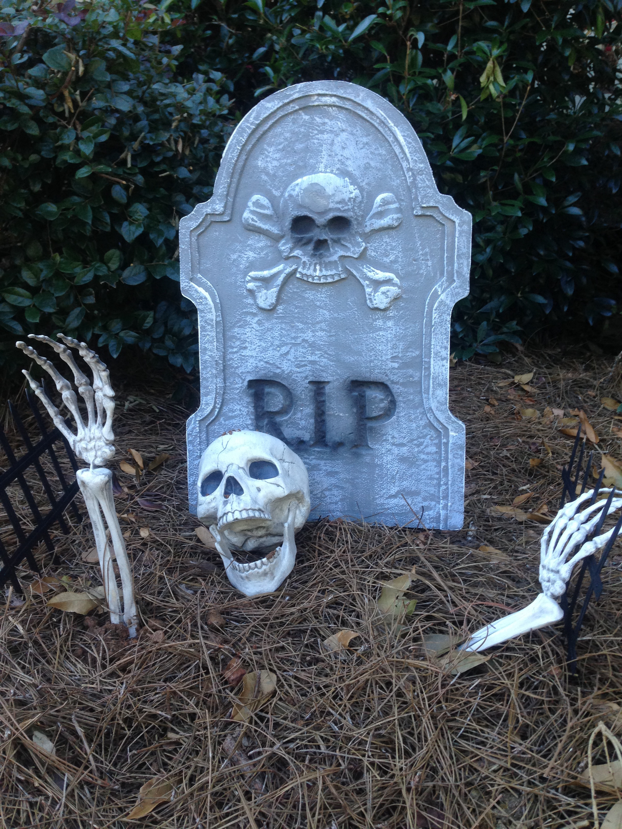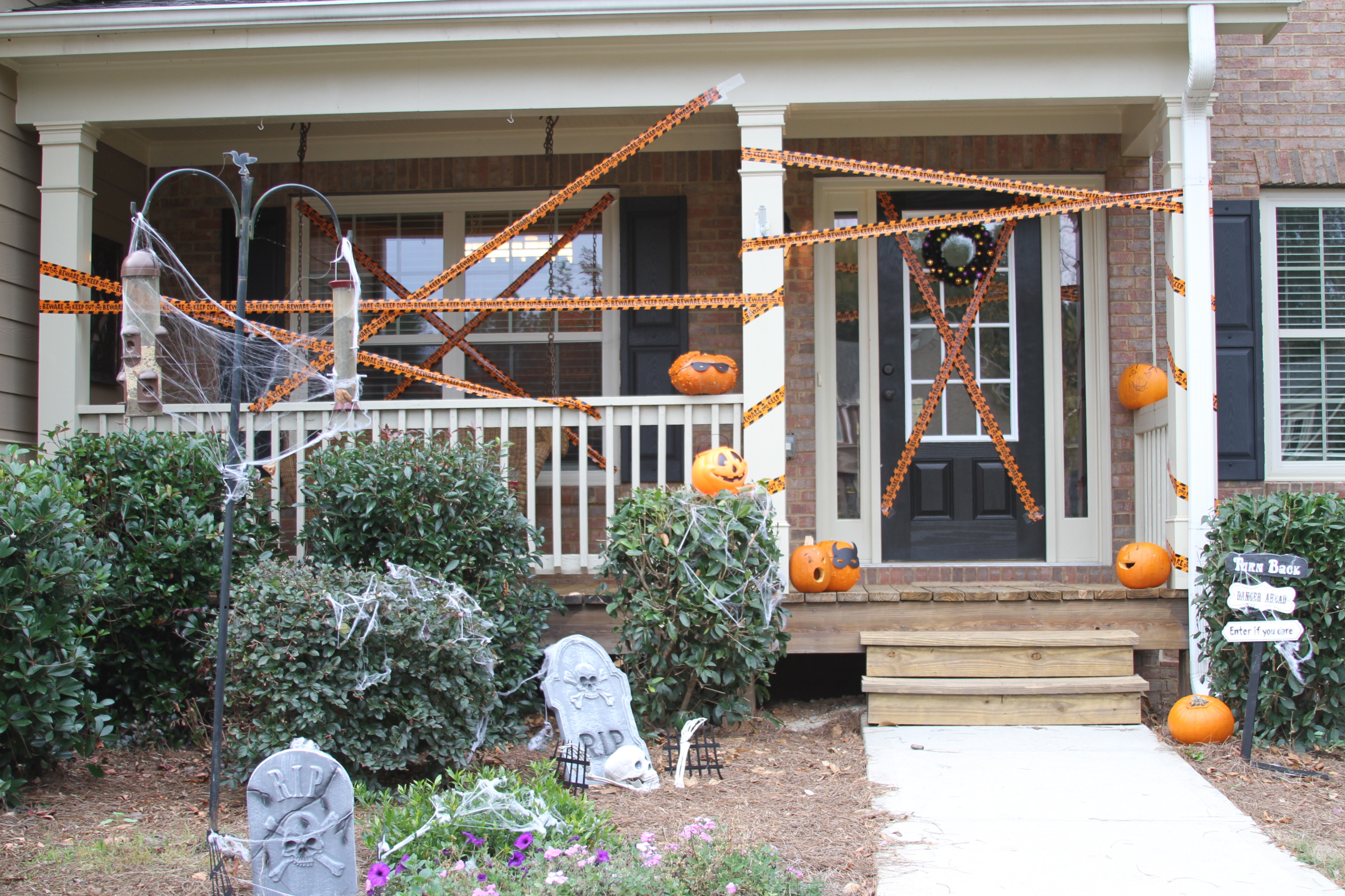 So this is how the house at the end of the culdesac got decked out. The orange crime scene tape says “Keep Out! Beware!”. There are abundant spider webs and grave sites, complete with scary, 8 legged, creatures. And you can’t see it in the picture, but there are “eyes” in the bushes that light up at night next to a black crow hanging in a cage that caws whenever anyone walks by. It’s not exactly the pretty fall decor I see all over Pinterest, but it definitely fits our family in 2013!