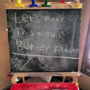 Walked into the playroom today and saw that someone had written a new message on the chalk board. Yes, my dear ones, let’s make this world a better place. One minute at a time, one hour at a time, one day at a time. Each thing we do can make YOUR world, MY world, OUR world a better place!